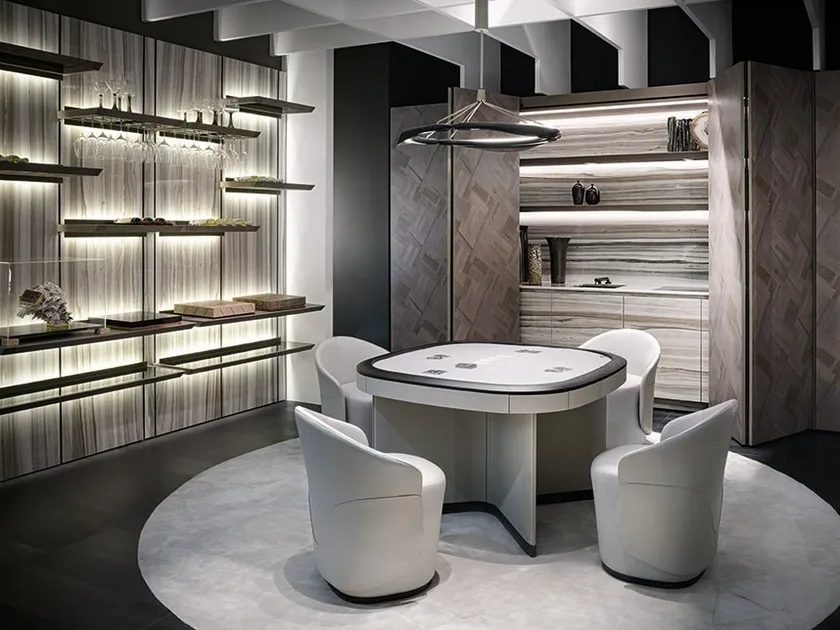 Этот современный игровой стол отражает современный стиль, который объединяет традиционные и инновационные элементы дизайна. Его гладкие линии и утонченные отделки создают визуально привлекательный эффект, делая его центром внимания в любой комнате. Дизайн вдохновлен профессиональными покерными столами, интерпретированными для жилого пространства, что позволяет ему без труда вписаться в различные декоративные контексты.