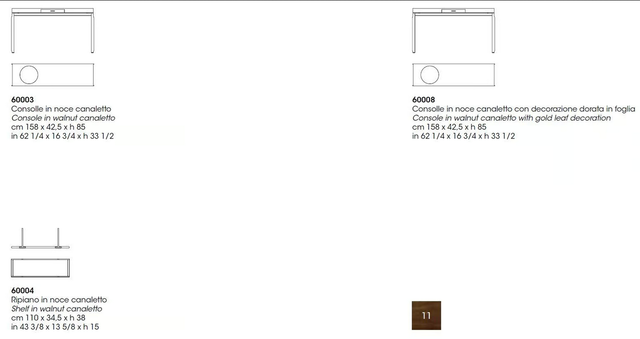 Сделанный из высококачественного дерева ореха канале, консольный стол обладает устойчивыми и экологически чистыми материалами, сертифицированными по международным стандартам. Дерево дополнено металлическим основанием, что обеспечивает долговечность и стойкость. Отделка включает в себя потрясающие детали из золота, которые добавляют роскоши, в то время как ореховое дерево мастерски отполировано для подчеркивания его натуральной текстуры и красоты. Эта комбинация материалов и отделок не только повышает эстетическую привлекательность стола, но и гарантирует, что он останется вечным дополнением к вашему дому.