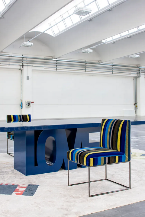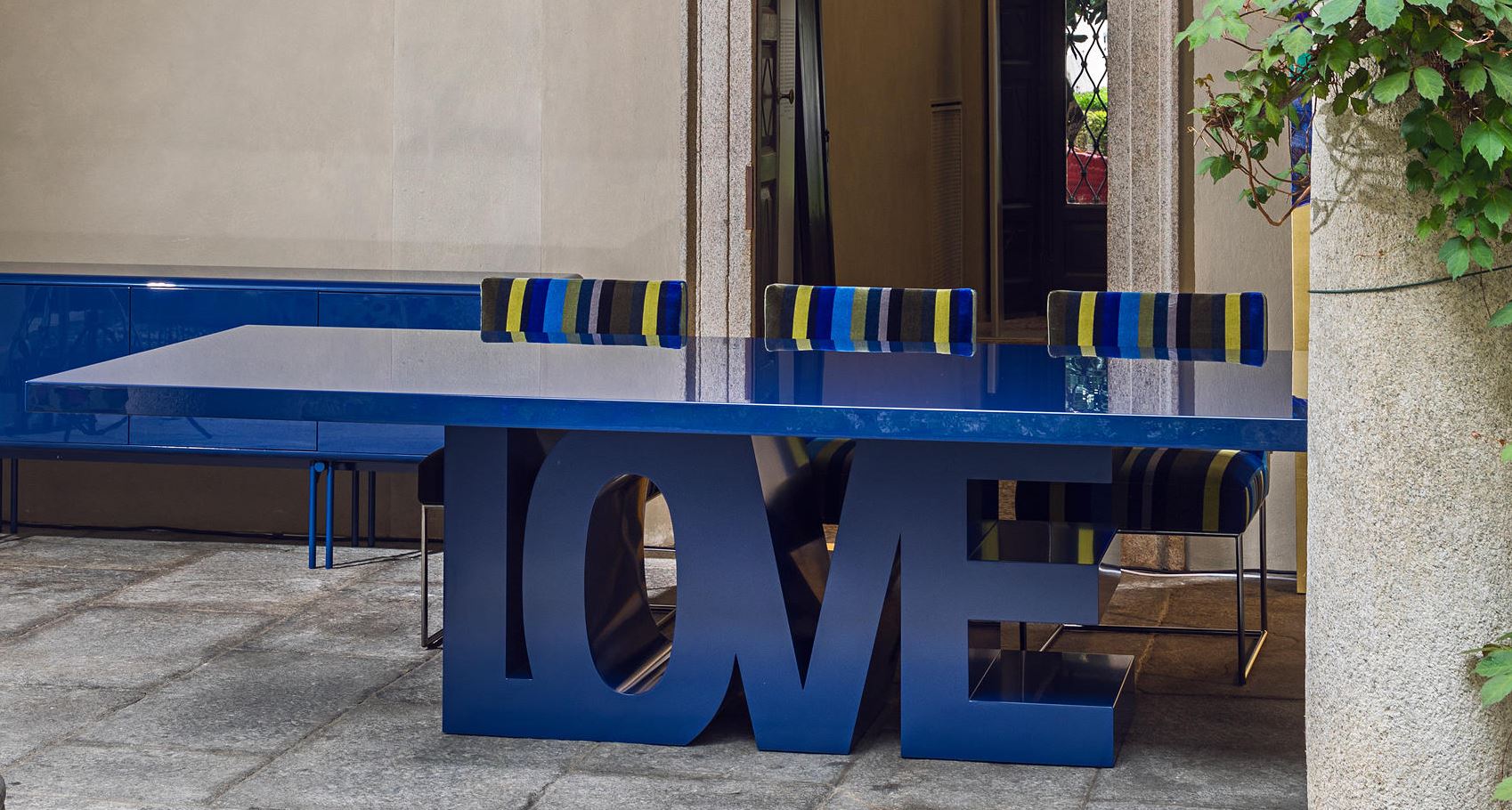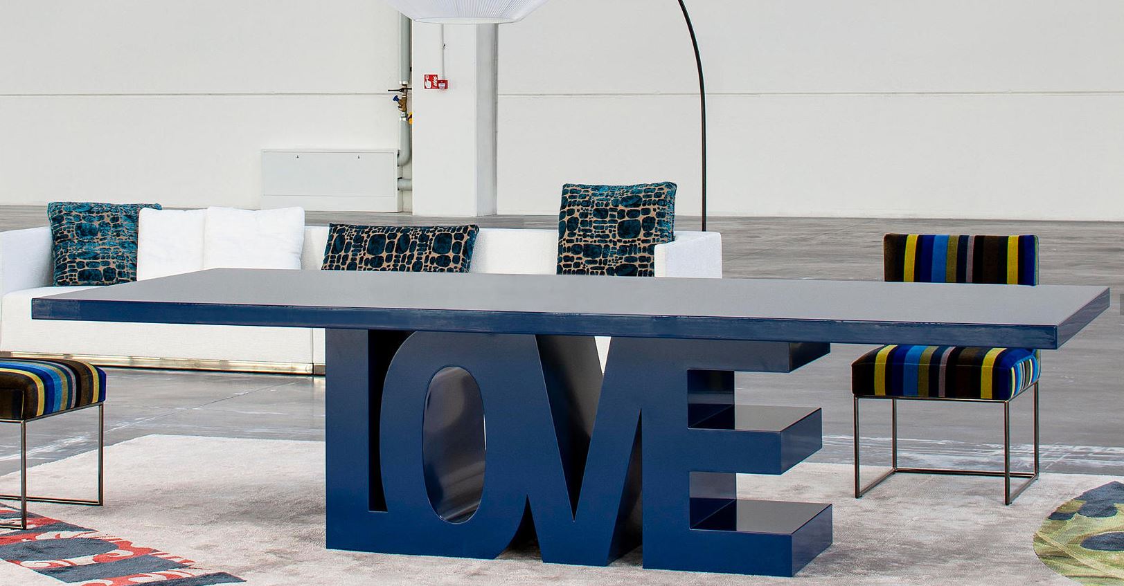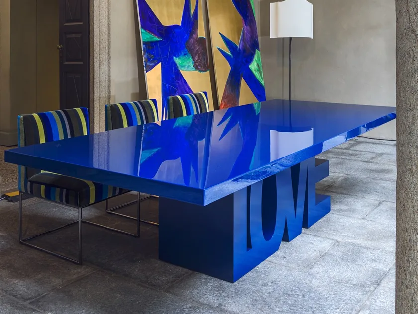 Дизайн стола включает в себя яркое сопоставление текстур, с гладким лакированным деревом, контрастирующим с прочной металлической основой. Смелая надпись "LOVE" добавляет игривый, но в то же время изысканный штрих к изделию, приглашая к теплоте и связи. Внимание к деталям в отделке, таких как бесшовные соединения и качество материалов, демонстрирует мастерство, вложенное в создание этого уникального обеденного стола.
