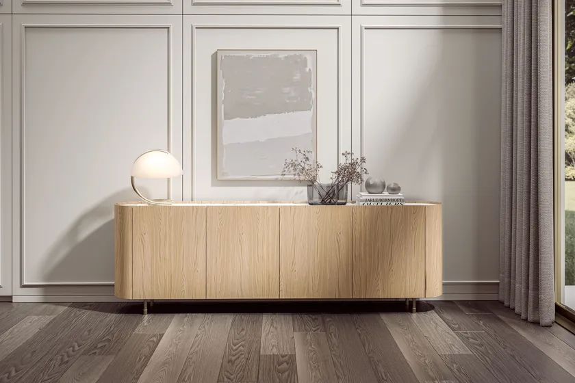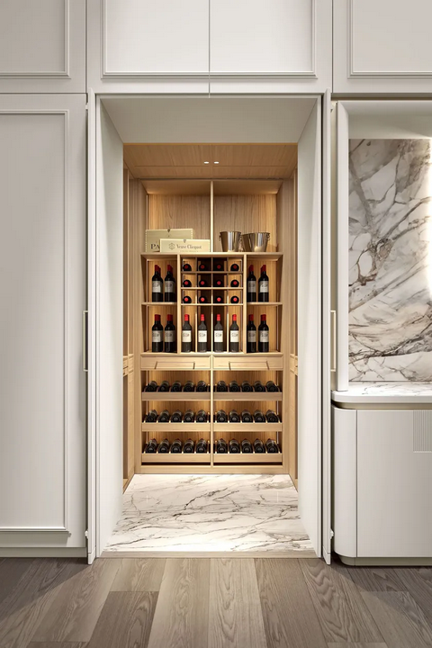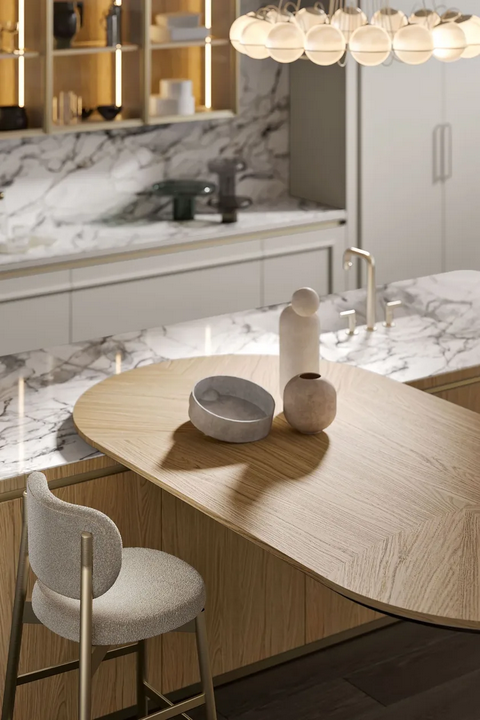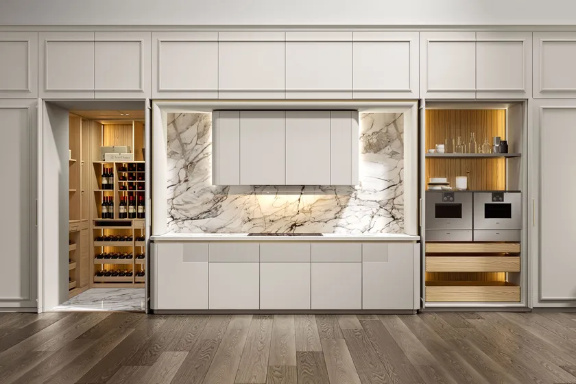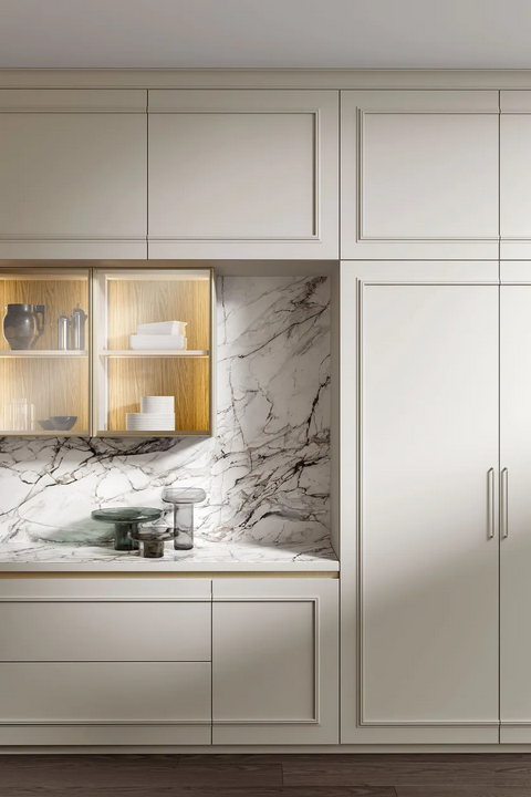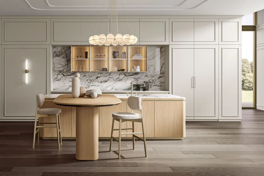 Внимание к деталям является ключевым в дизайне кухни Радха 2.0. Элегантные рамки и лакированные фасады создают эффект бо́йери, превращая поверхности в изысканные панели. Настенные шкафчики с стеклянными дверями и металлическими профилями цвета шампанского добавляют выразительный визуальный элемент, улучшая общую атмосферу кухни. Сочетание гладкого натурального дубового острова с мраморной столешницей Carrara Venato дополнительно поднимает эстетическую ценность кухни, создавая привлекательное пространство для кулинарной креативности.