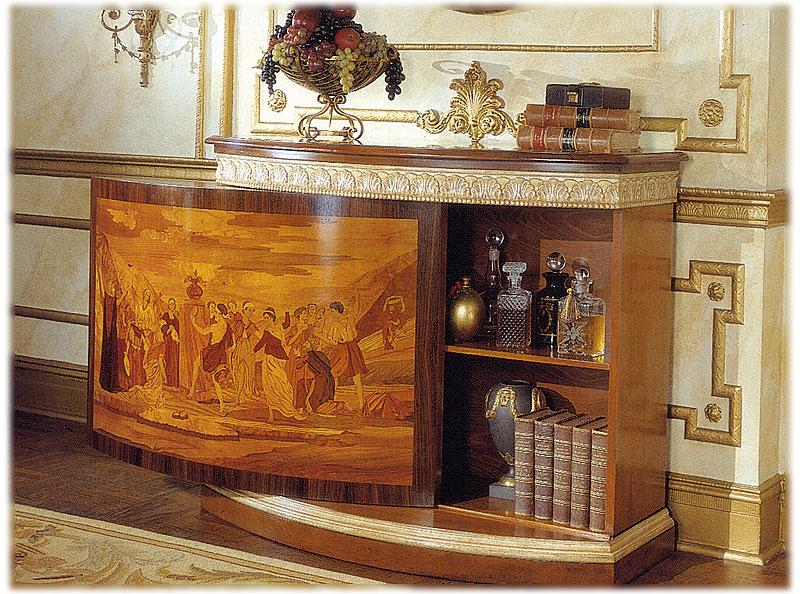 Инкрустированный буфет, каркас из натурального дерева с декорированной резьбой, с раздвижной дверью и внутренними полками.